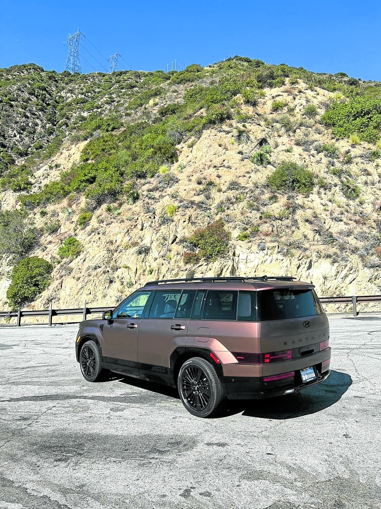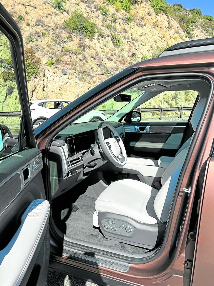 How does the car drive with all this mass and space? We drove it with a 1.6-liter hybrid up and around curvy mountain roads. This powerplant was meant for the US market and skewed for more electric use, but it showed how Hyundai dealt with the increased weight and size. The new Santa Fe follows the family line of comfort, and it isn’t a ‘handling car’ but it does settle easily into corners with stability and smoothness.